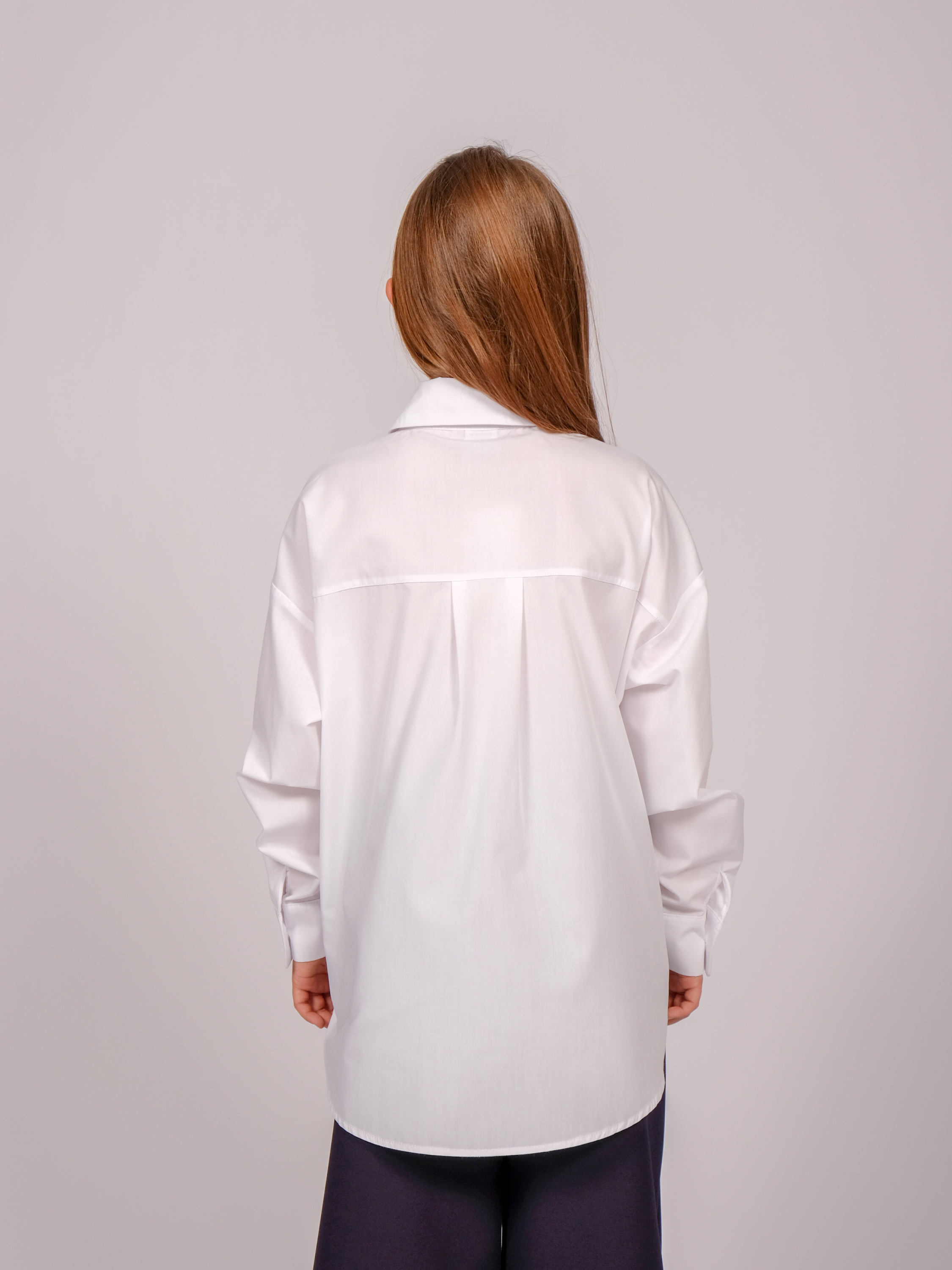 Школьная рубашка для девочки оптом. Модель объемная, прямого кроя, застегивается на пуговицы, рукава с манжетами.