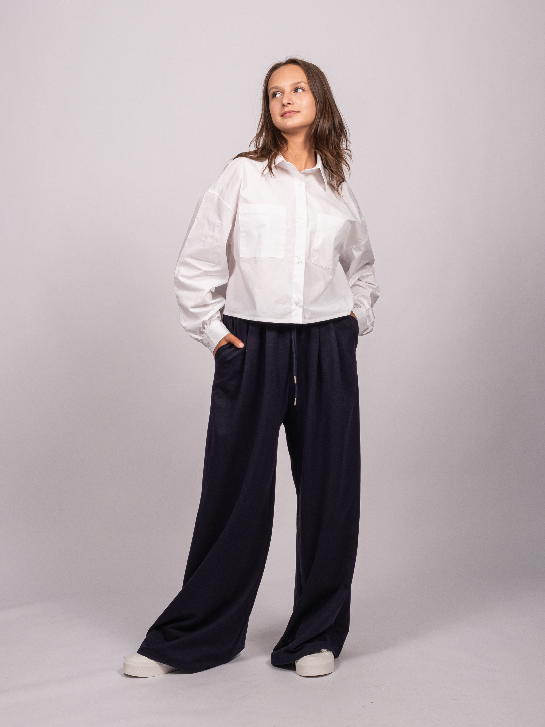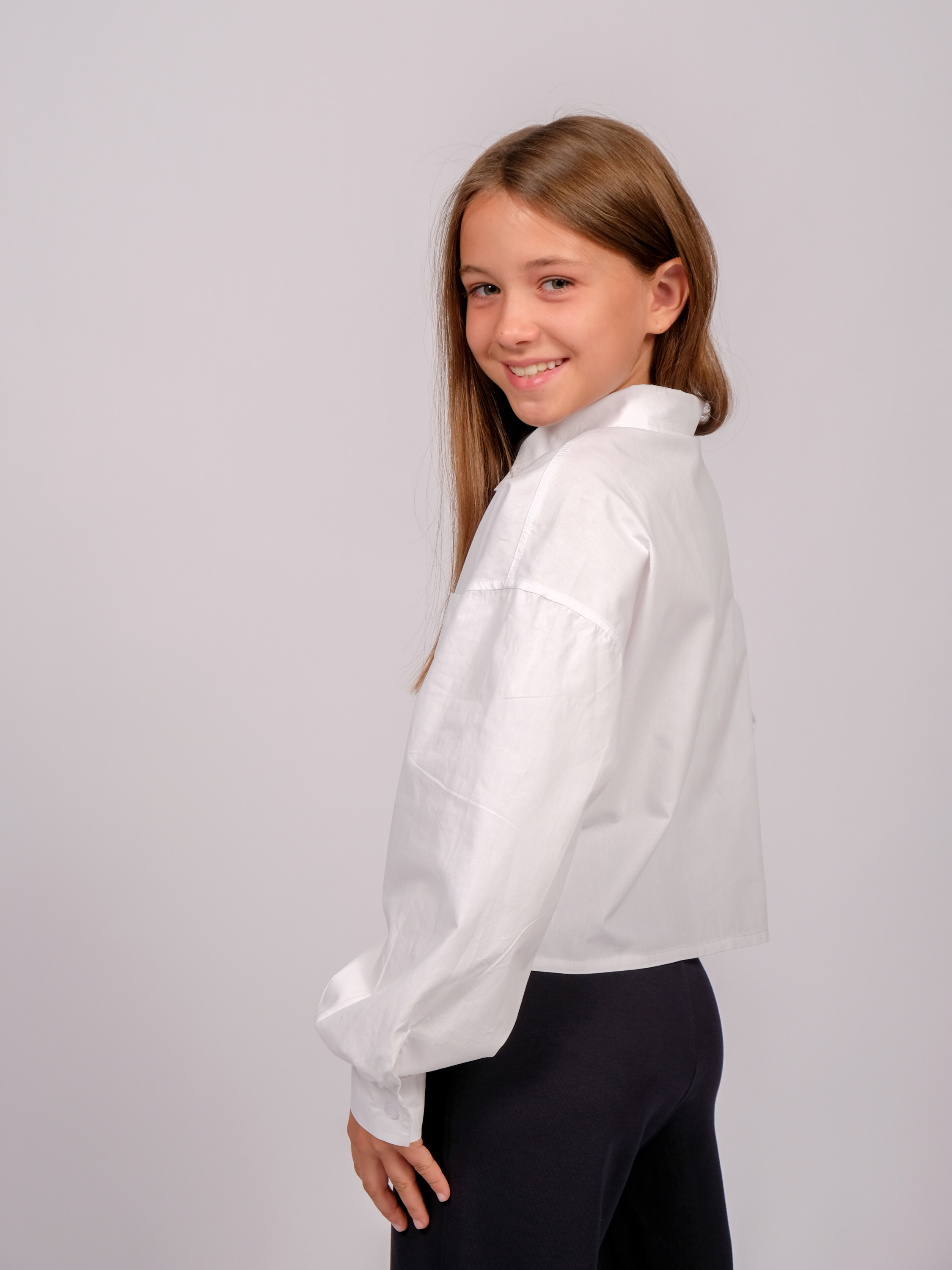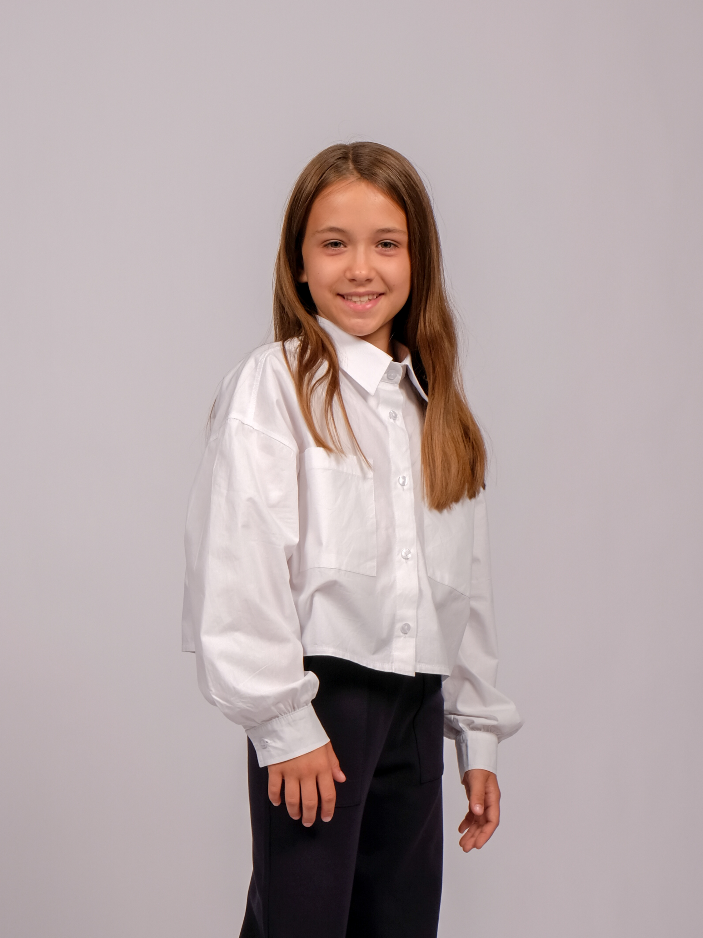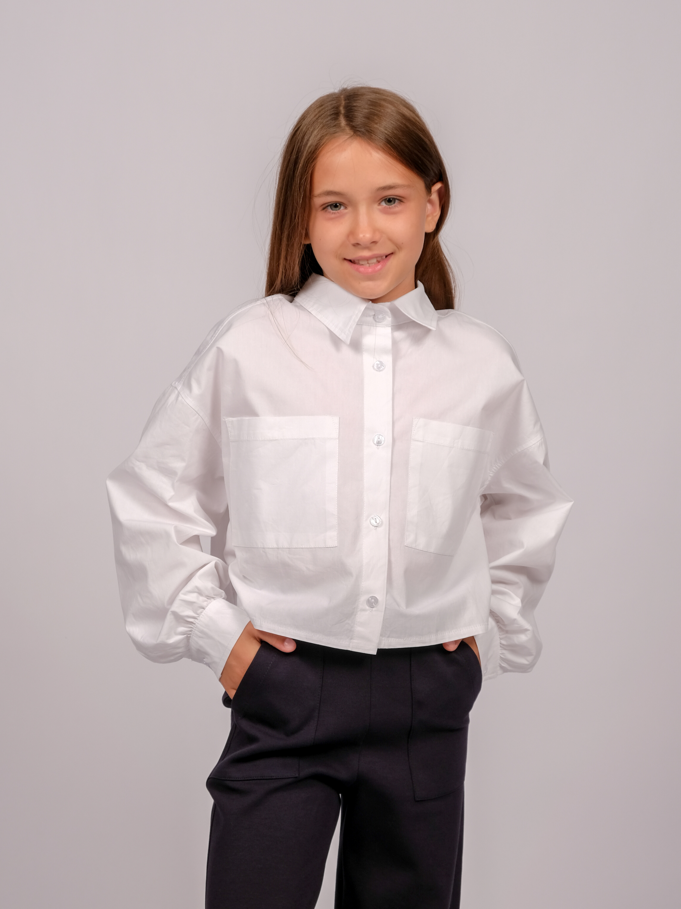 Укороченная рубашка для девочки оптом. Модель объемная, прямого кроя, застегивается на пуговицы, рукава с манжетами, на груди два накладных кармана.