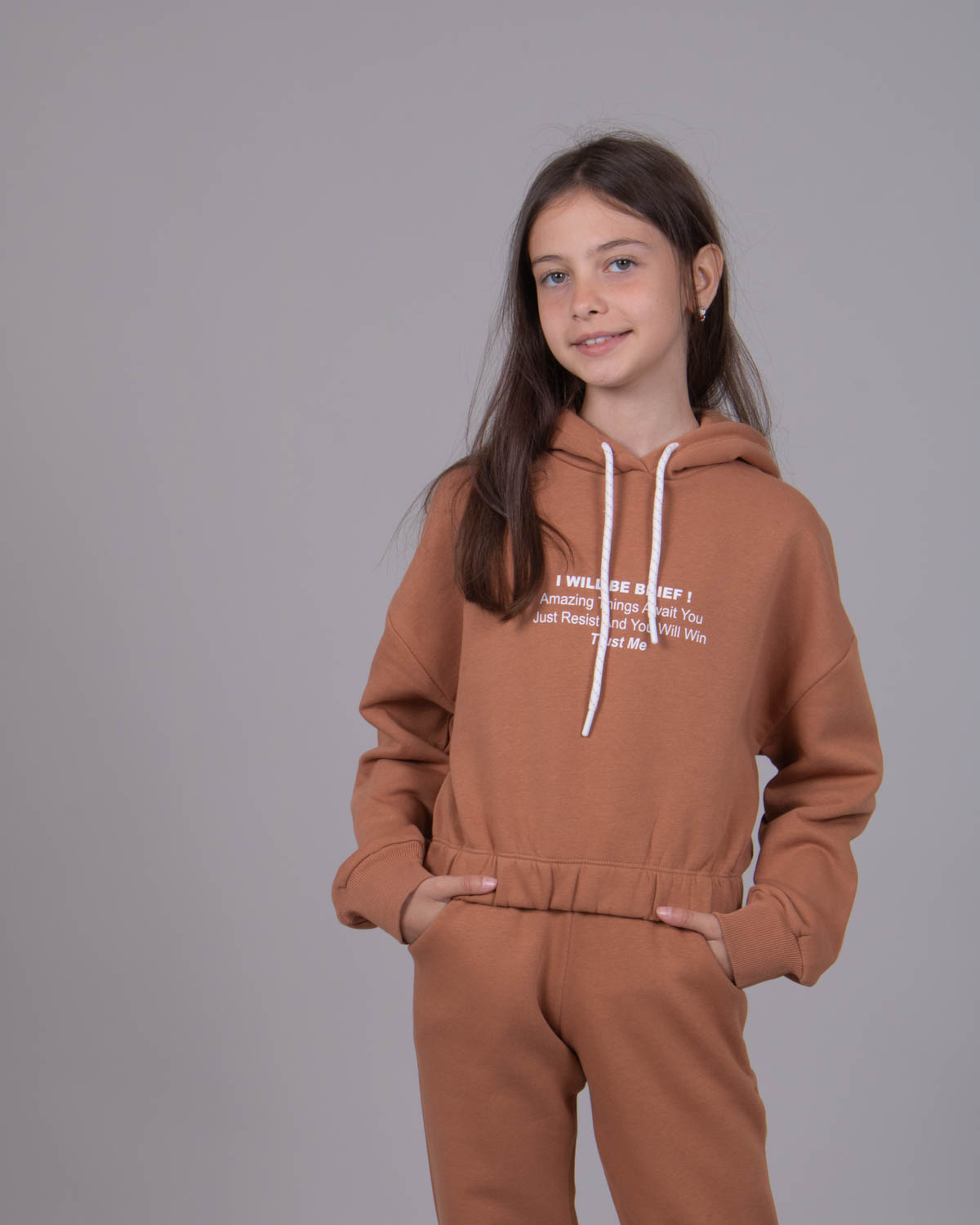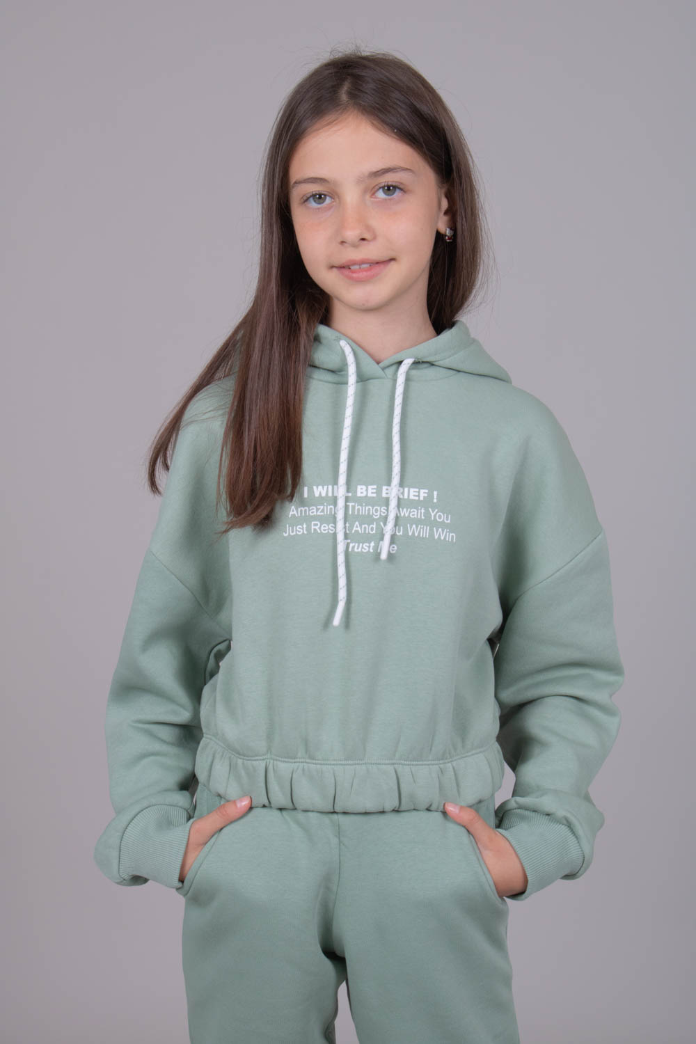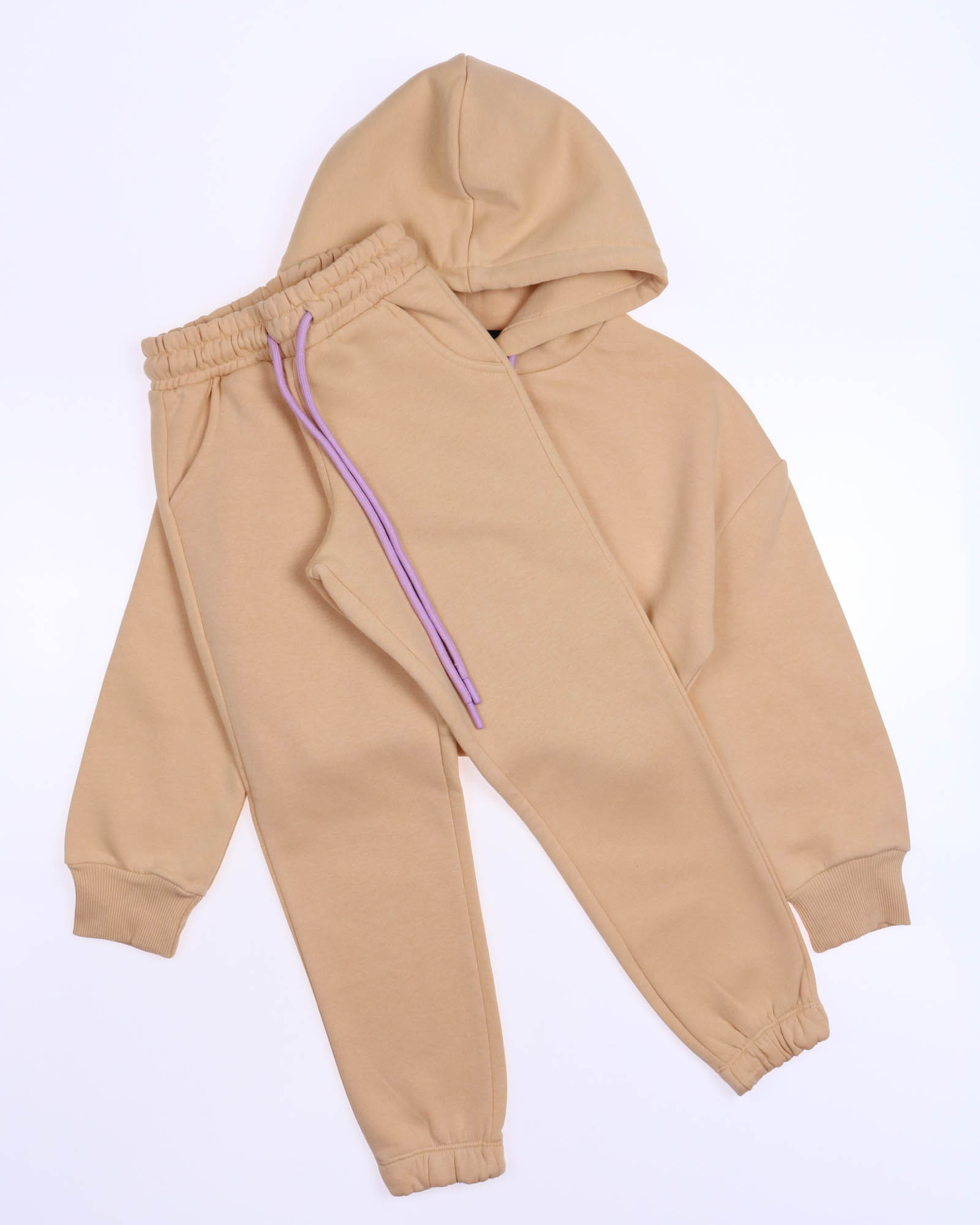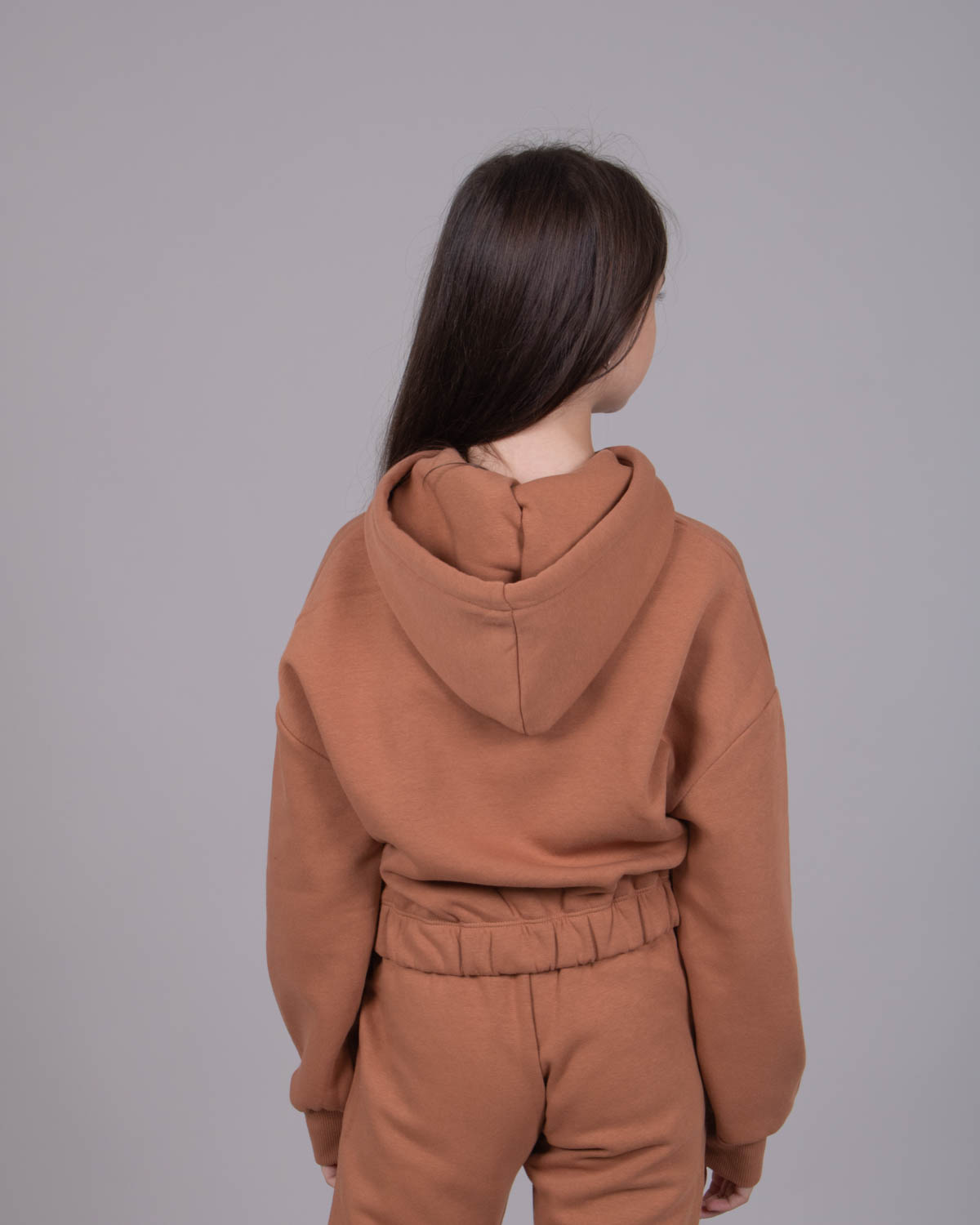Утеплённый спортивный костюм для девочек в  из плотного футера с начесом. Оптимальный объём худи не будет сковывать движений, легко сочетается с верхней одеждой. Худи укороченное на резинке, с объемным капюшоном. Утеплённые брюки на манжетах с боковыми карманами.