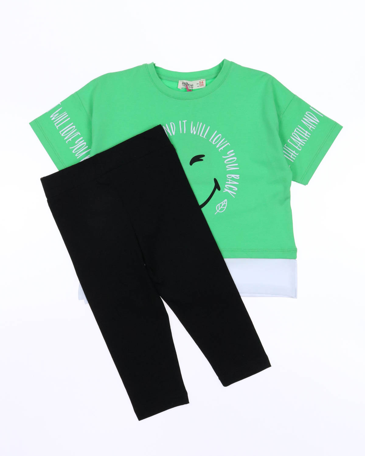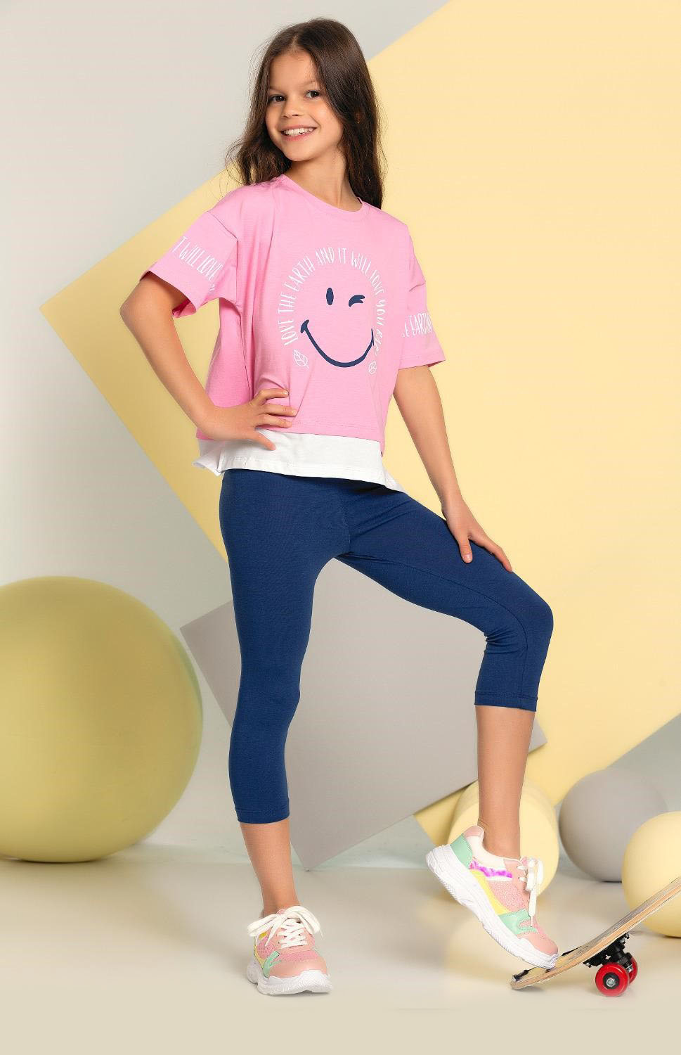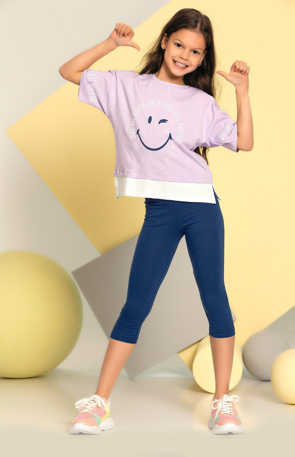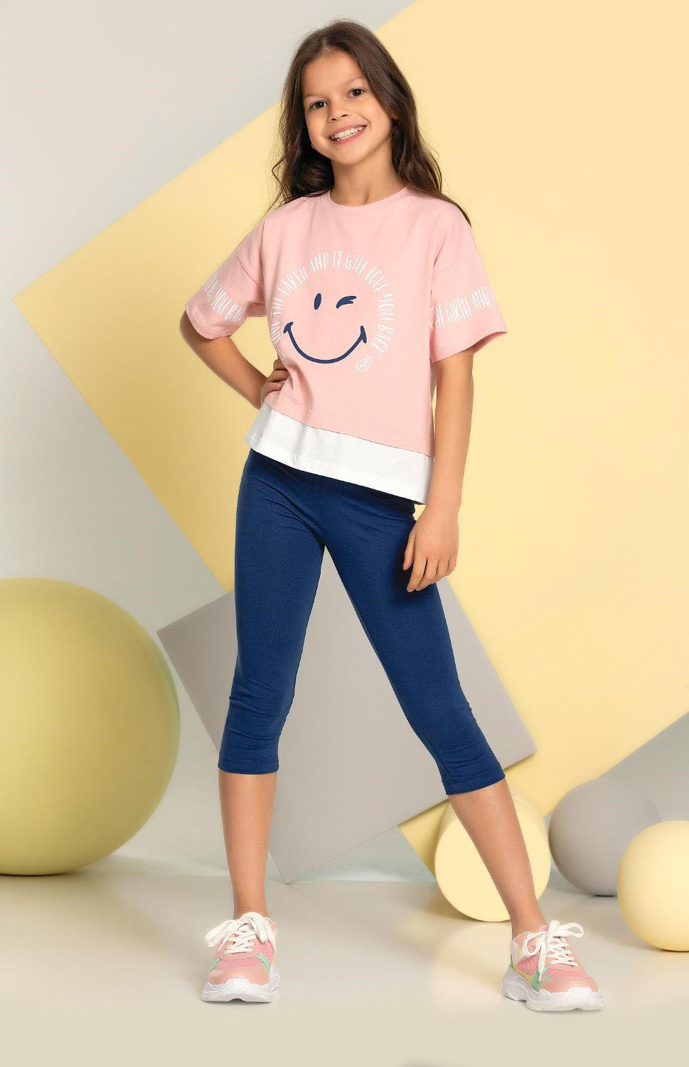 Костюм отлично сидит на фигурах разных типов. Укороченная футболка со спущенными рукавами  и бриджи  делают летний комплект оригинальным и стильным. Костюм Smile  оптом выполнен из мягкого трикотажа кулирка.
