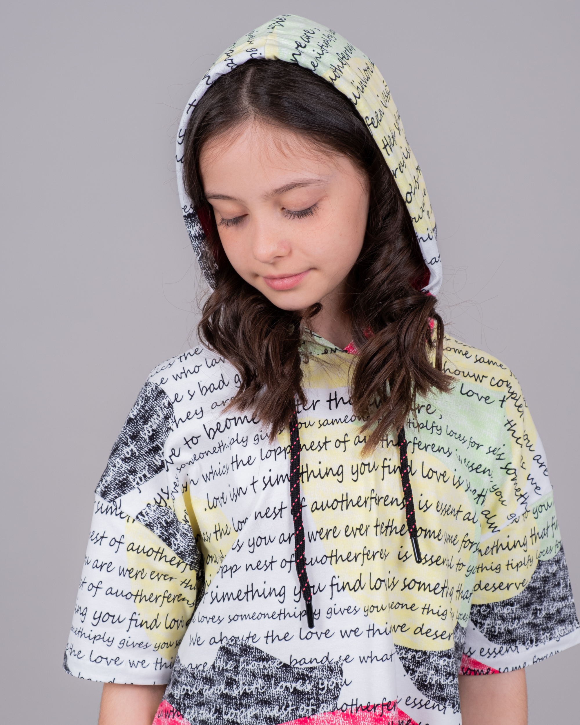 Летний костюм Cegisa для девочки оптом. Футболка с короткими рукавами, украшеная принтом и дополнена капюшоном со шнурком. Однотонные велосипедки облегающего кроя с поясом на резинке. Костюм изготовлен из хлопка с добавлением лайкры.