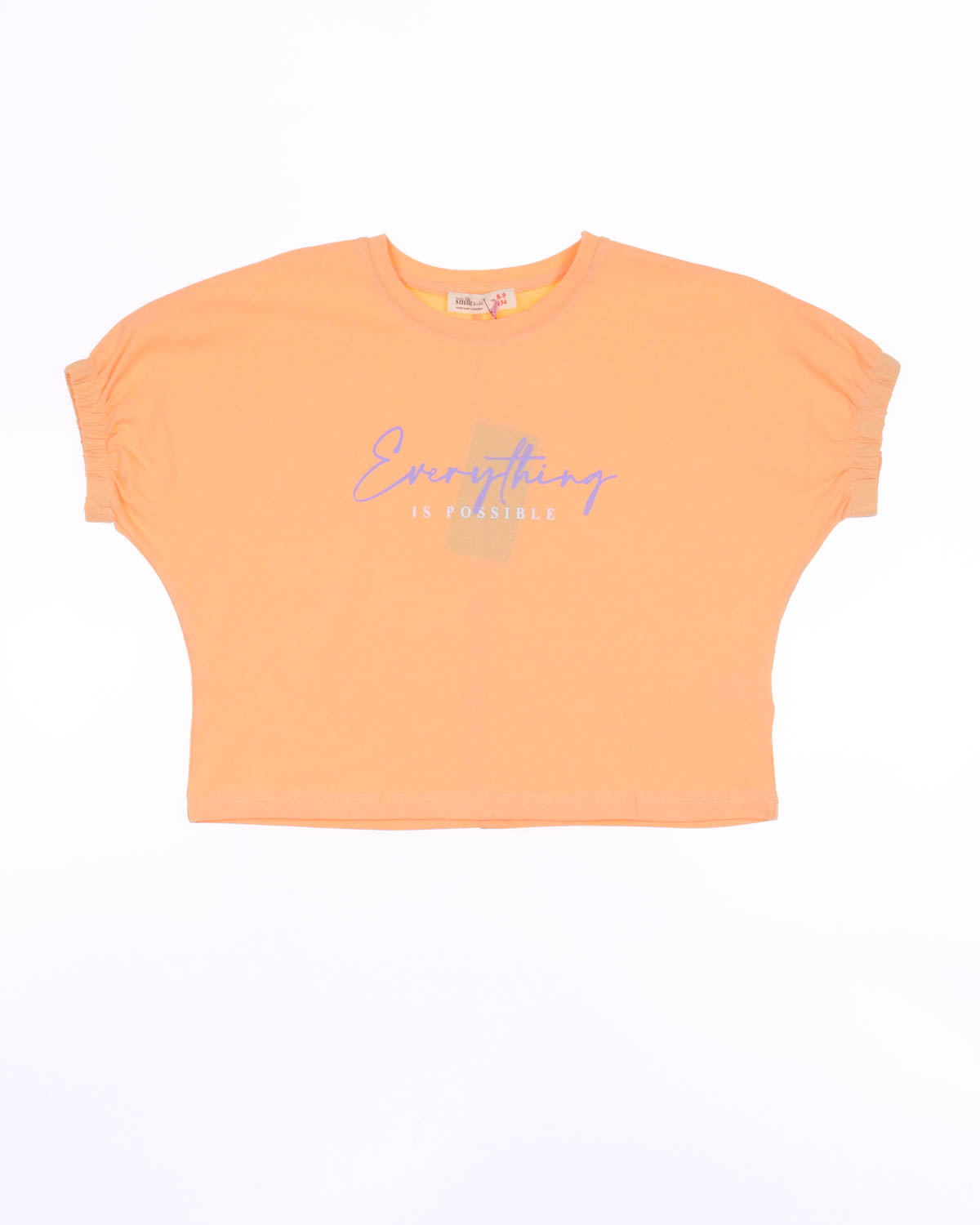 Стильный костюм Smile для девочки оптом. Укороченная футболка свободного кроя оформлена принтом. Рукава присборены резинкой. Широкие брюки с боковыми карманами и защипами на поясе создают модный образ. Костюм Smile для девочки оптом, выполнен из трикотажа кулирка.