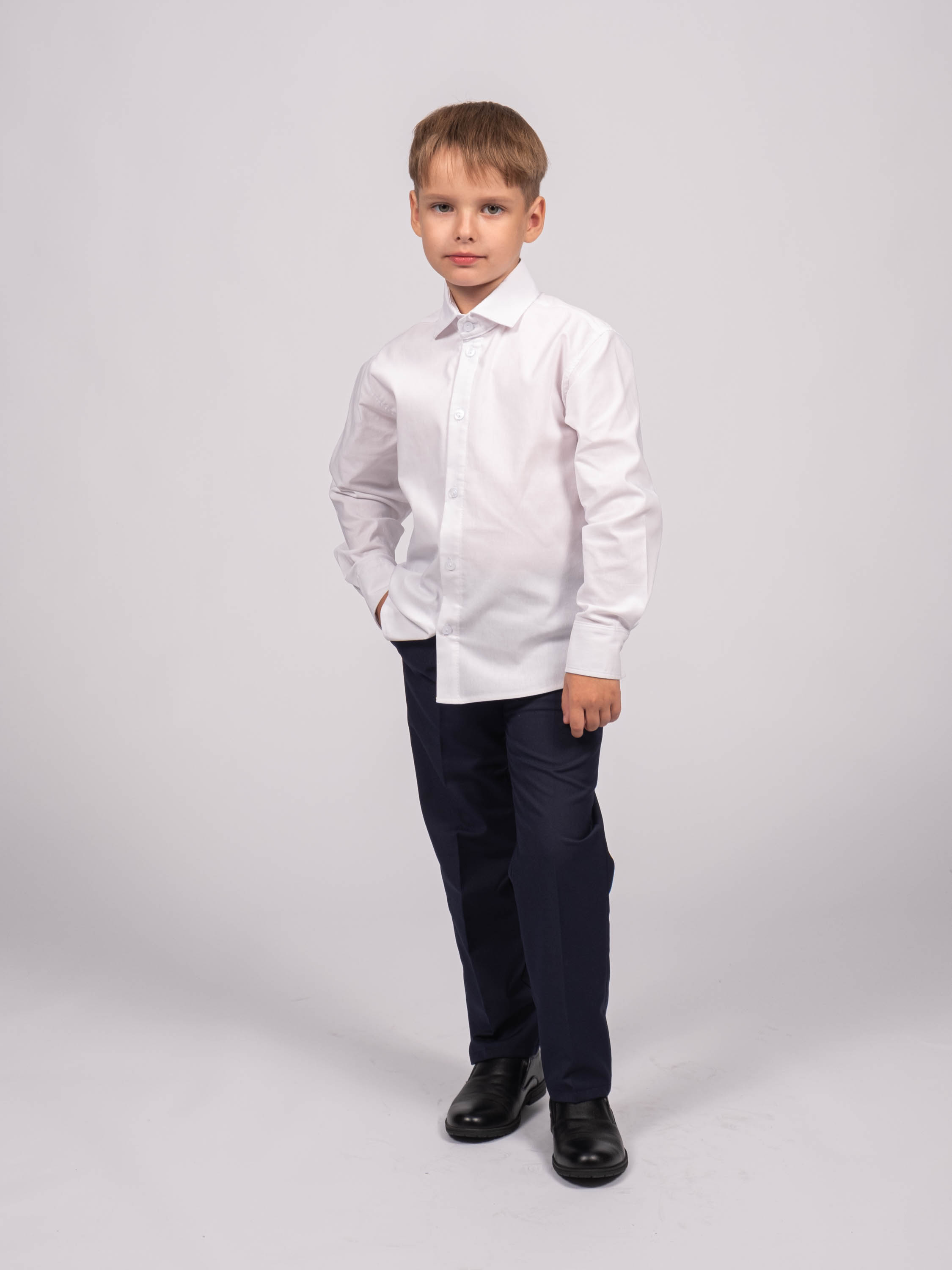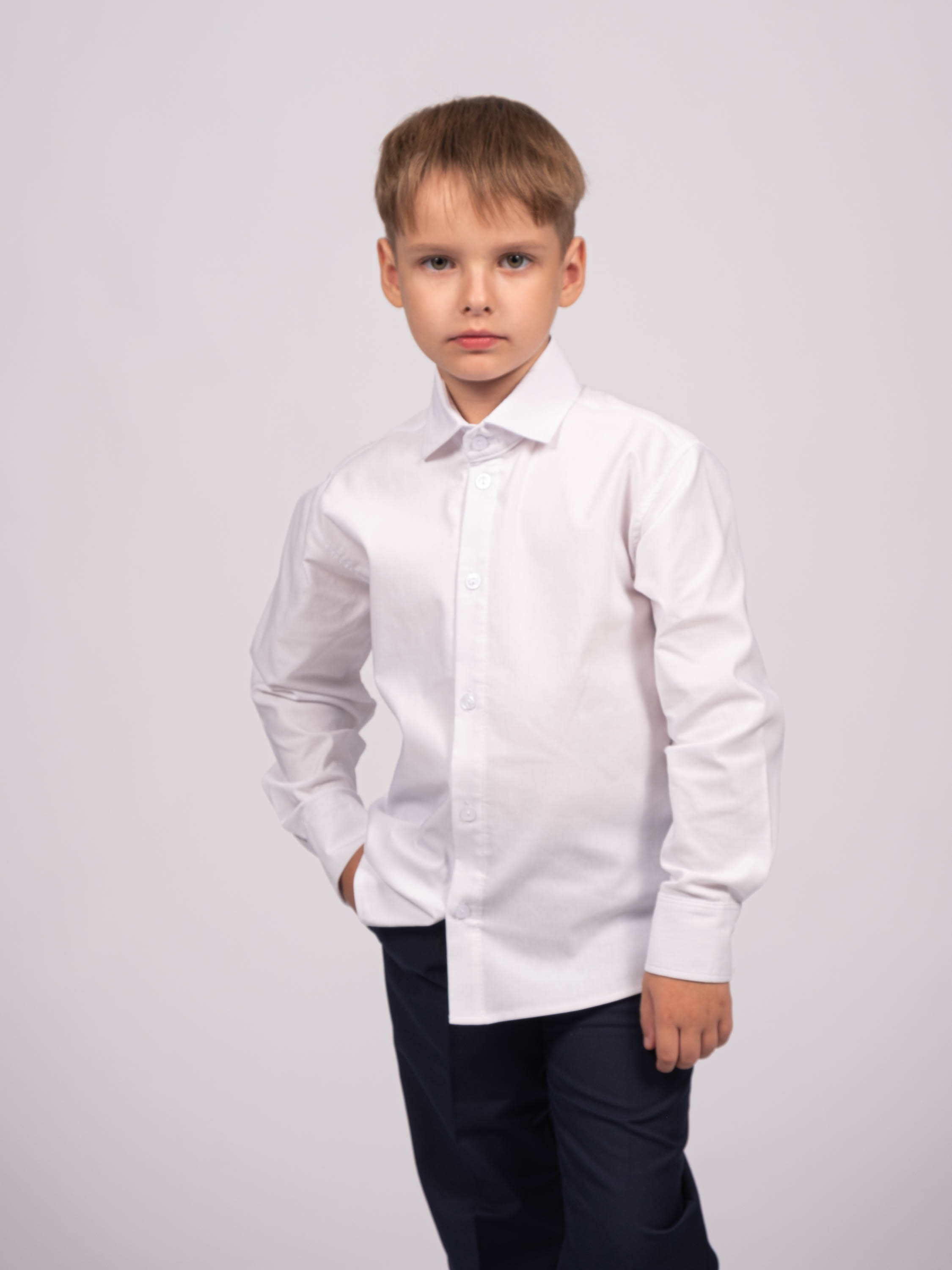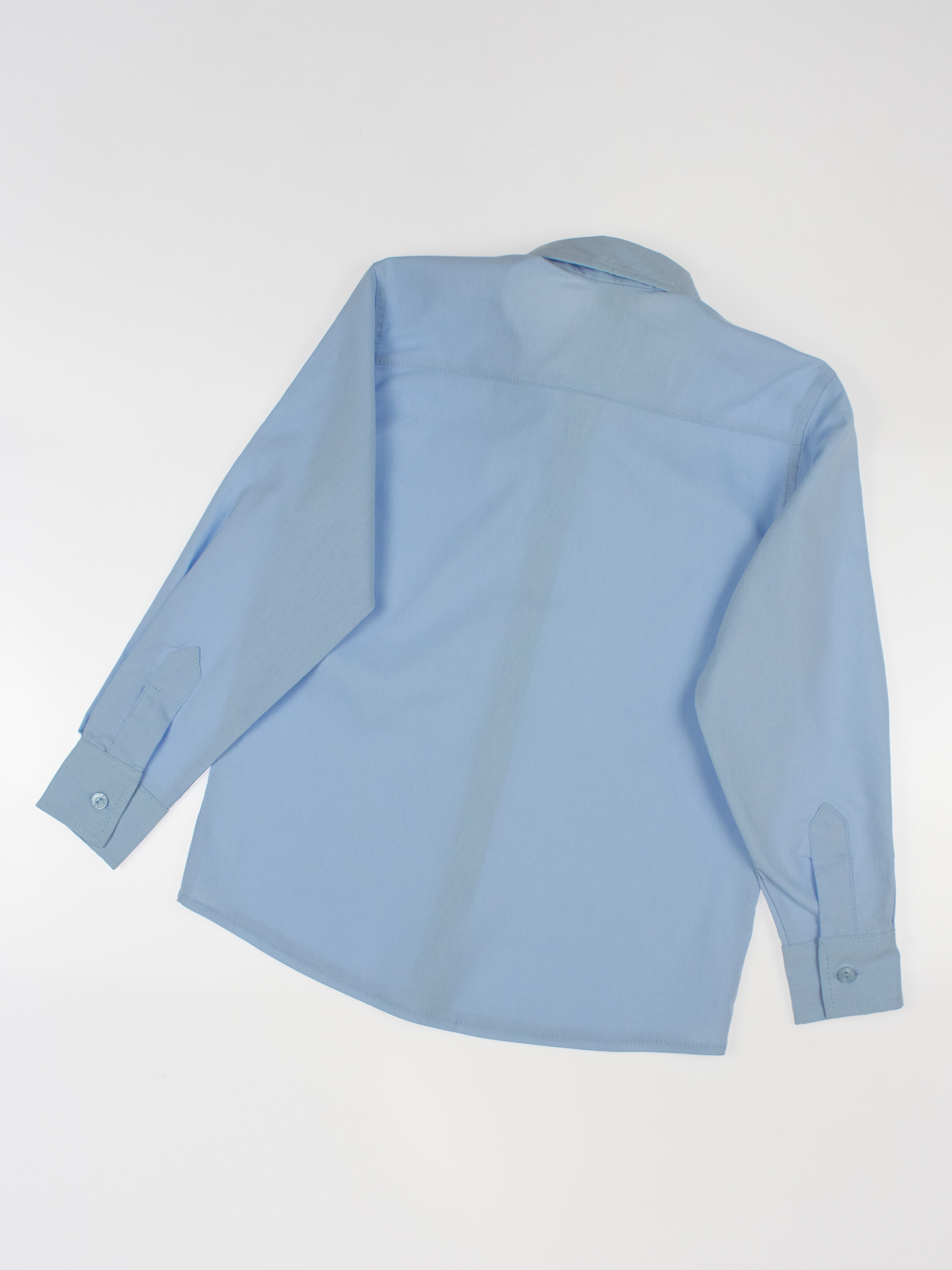 Детская однотонная рубашка для мальчика оптом. Рубашка изготавлена из смесового материала высокого качества. Модель застегивается на пуговицы.
