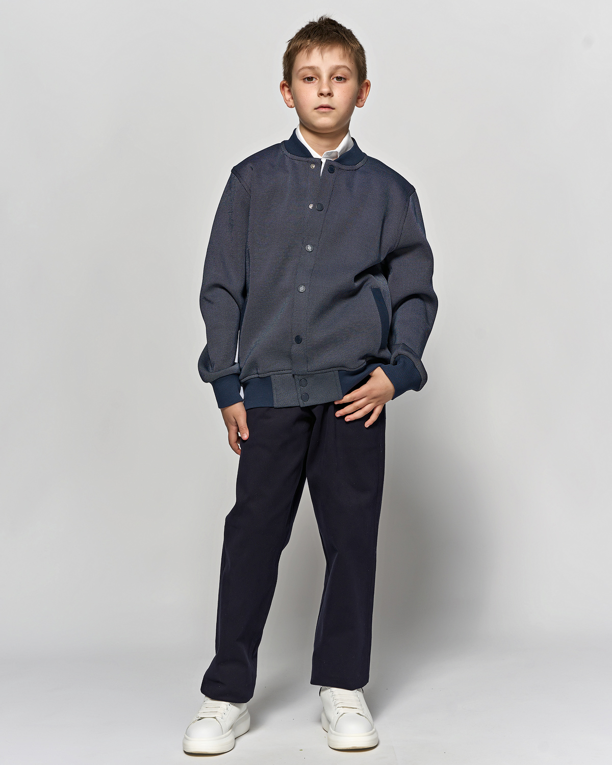 Трикотажный бомбер Cegisa для мальчика оптом. Выполнен из смесовой ткани, в составе которой натуральный хлопок с добавлением полиэстера. Воротник стойка. Низ изделия и рукава на трикотажном манжете. Вместительные карманы и разъемная застежка - кнопки. Хорошо сохраняет цвет и форму при длительной носке и после многократных стирок. Прекрасно будет смотреться как школьная форма.