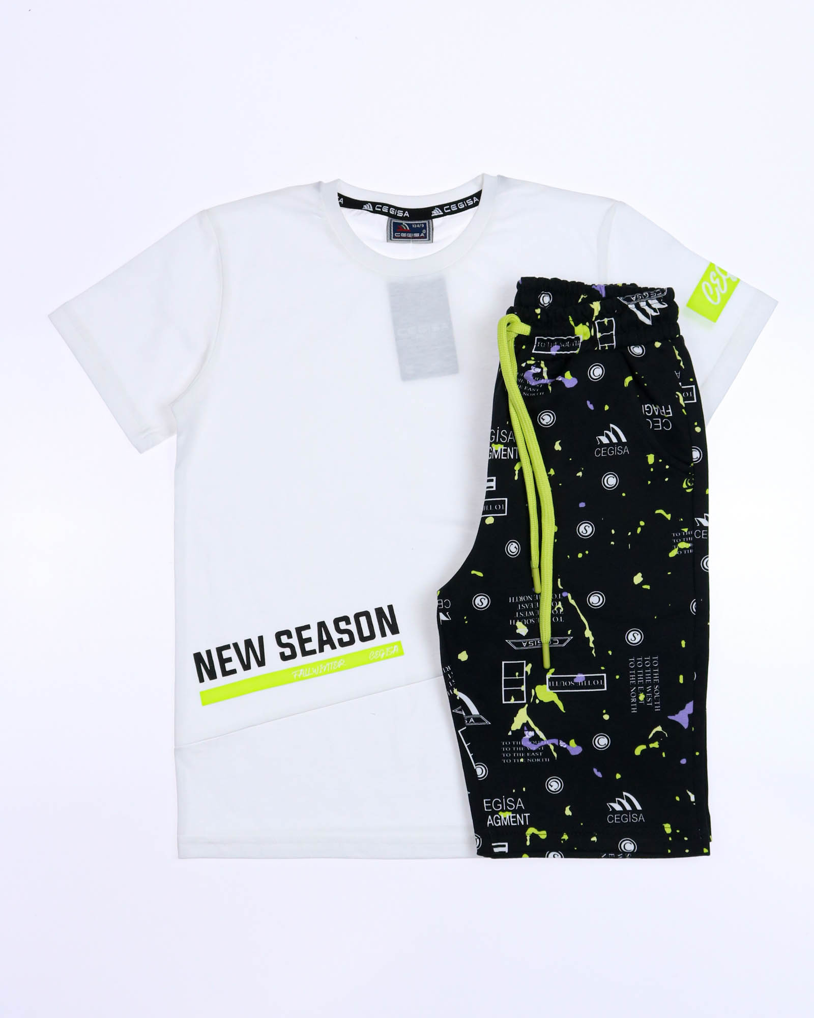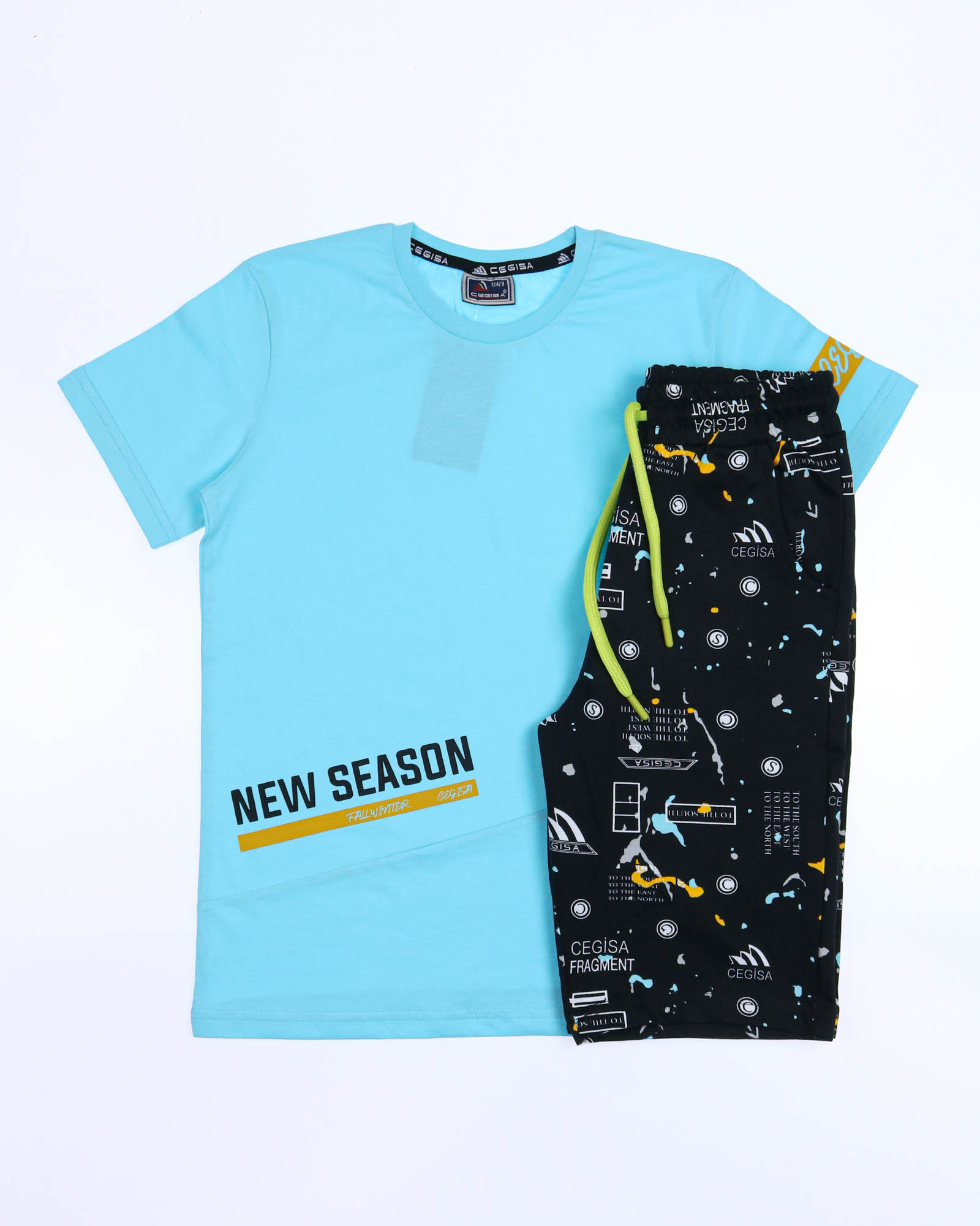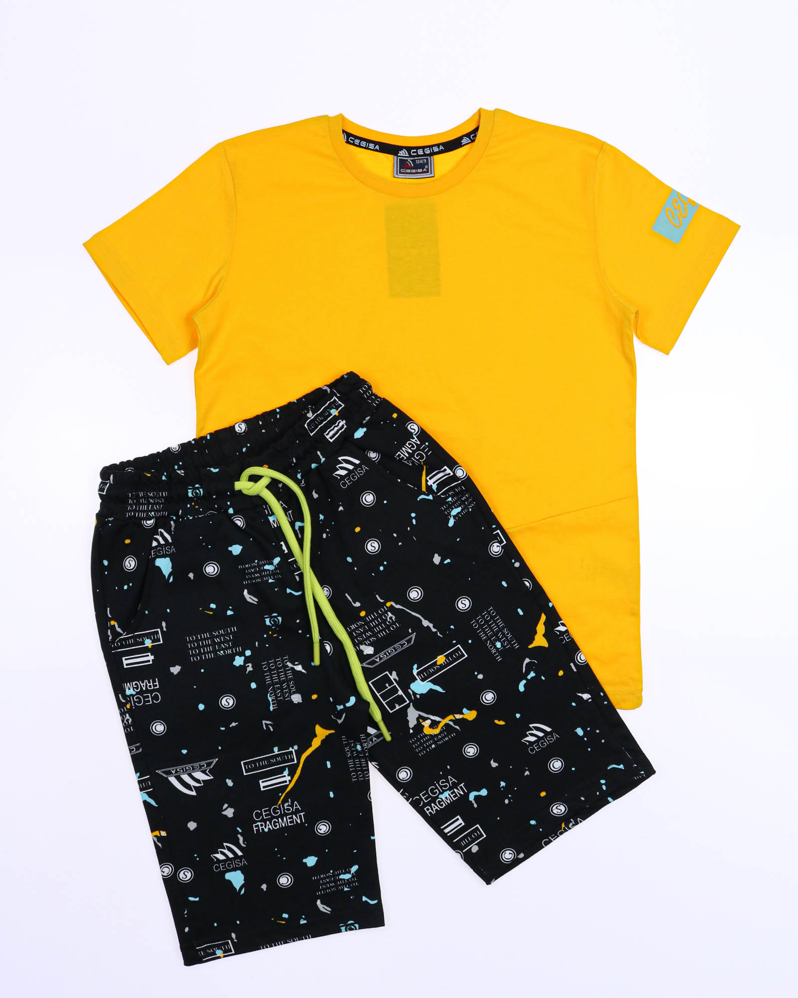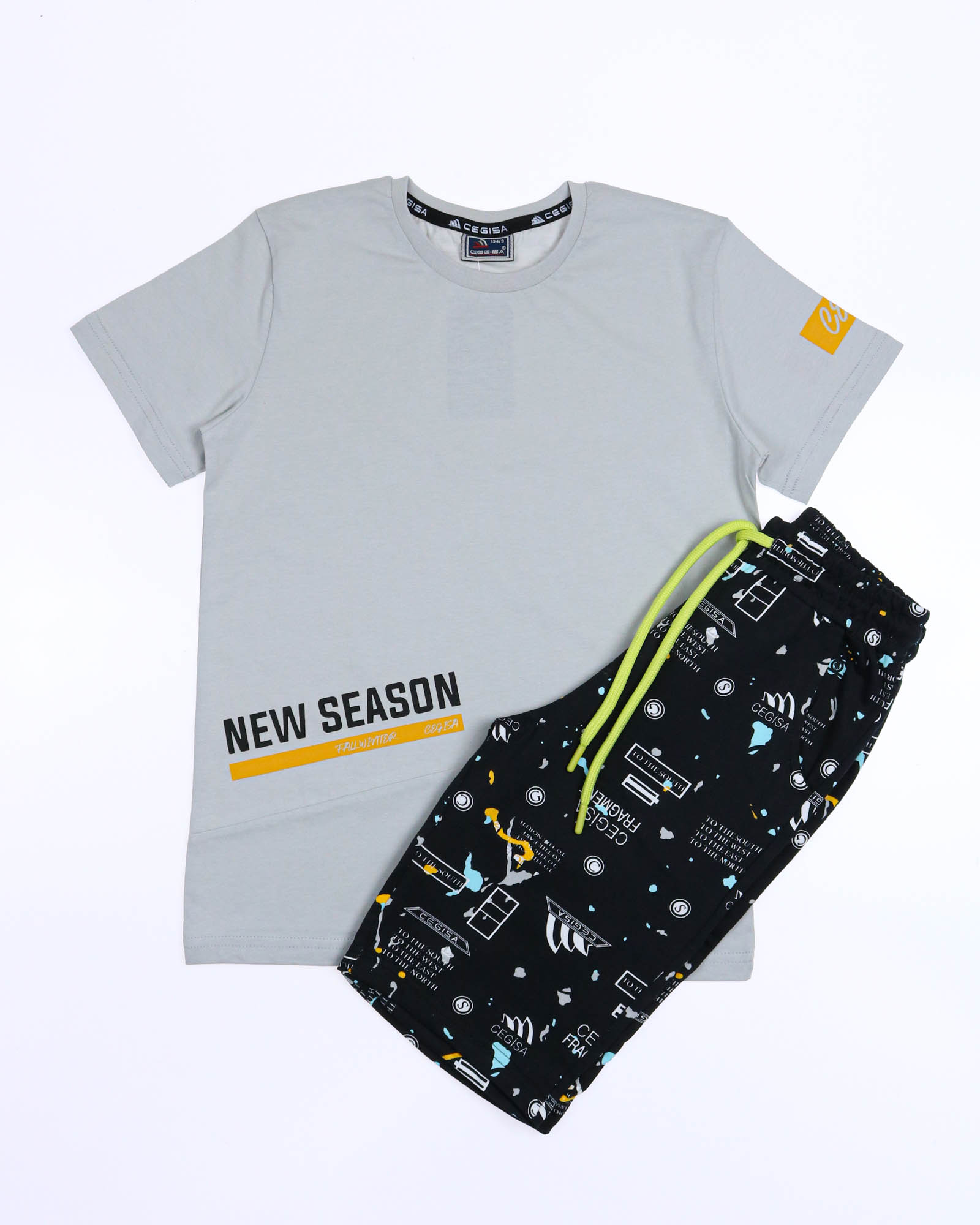 Трикотажный костюм CEGISA из хлопка оптом. Бриджи выполнены  из футера 2х нитки (петля)  с карманами, на эластичном поясе с регулируемым шнурком и оригинальным принтом. Футболка выполнена из кулирной глади, прямого кроя с округлой горловиной.