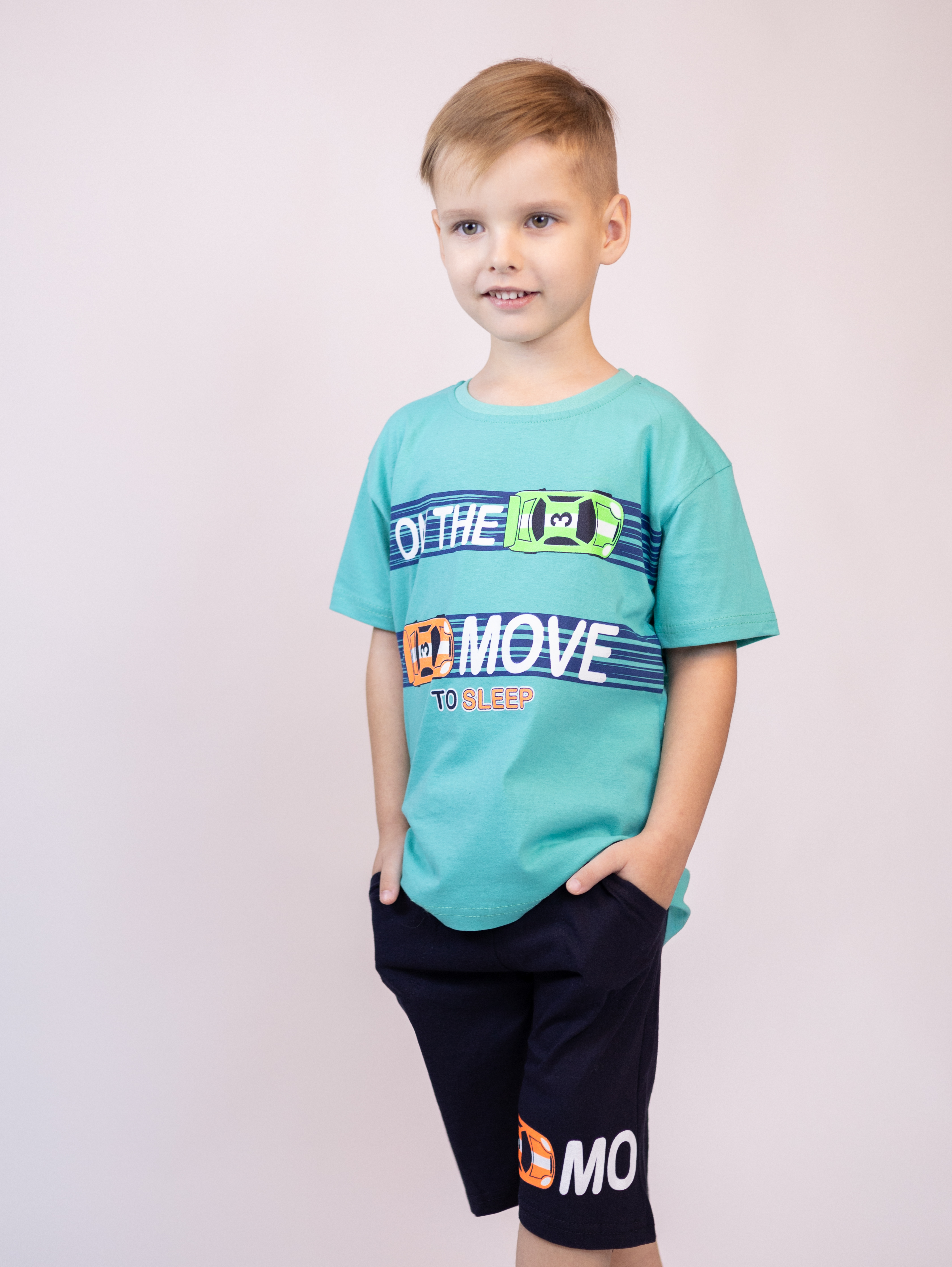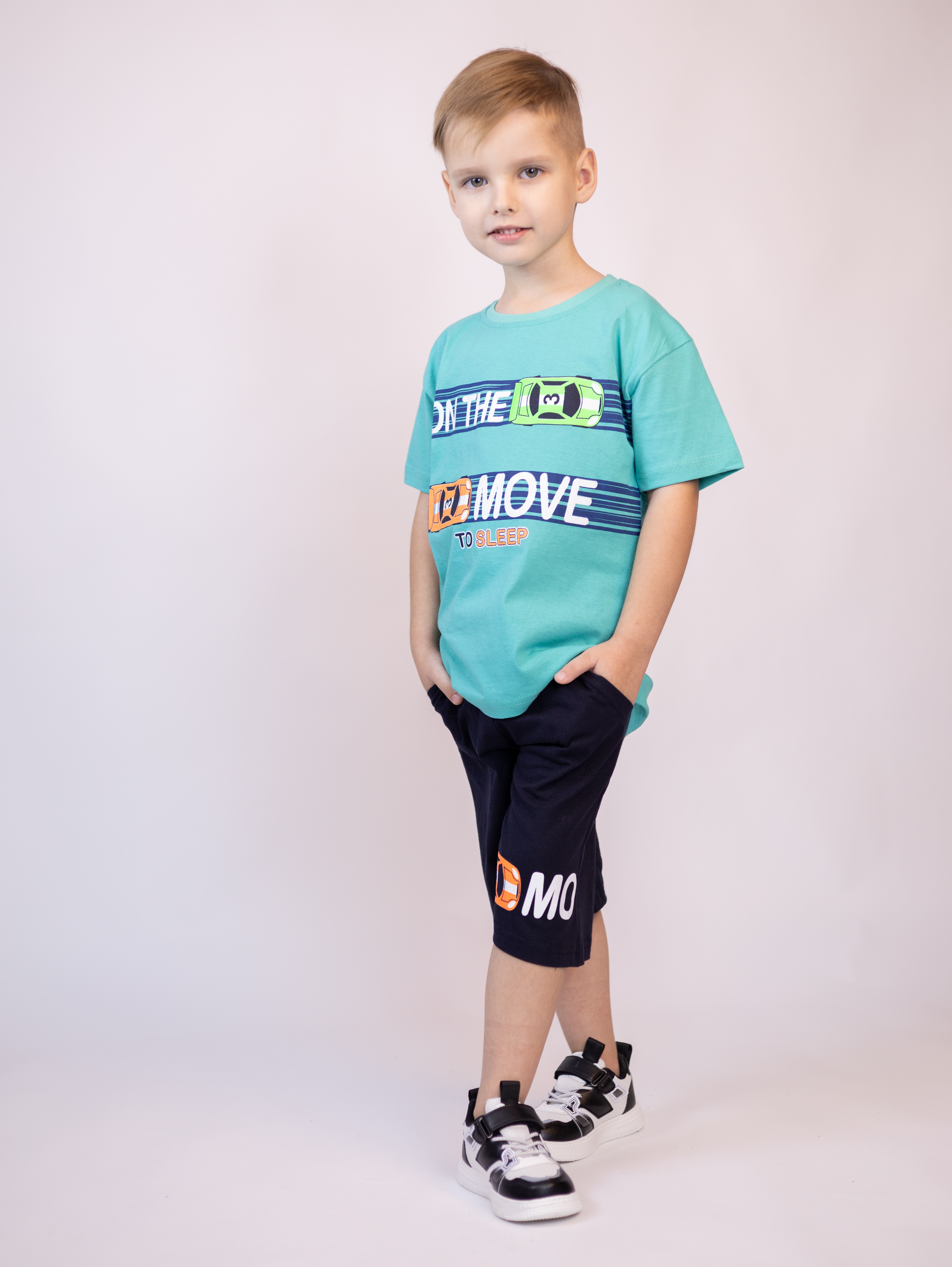 Трикожный костюм BOLD оптом из 100% хлопка с оригинальным, ярким принтом. Шорты трикотажные с карманами.