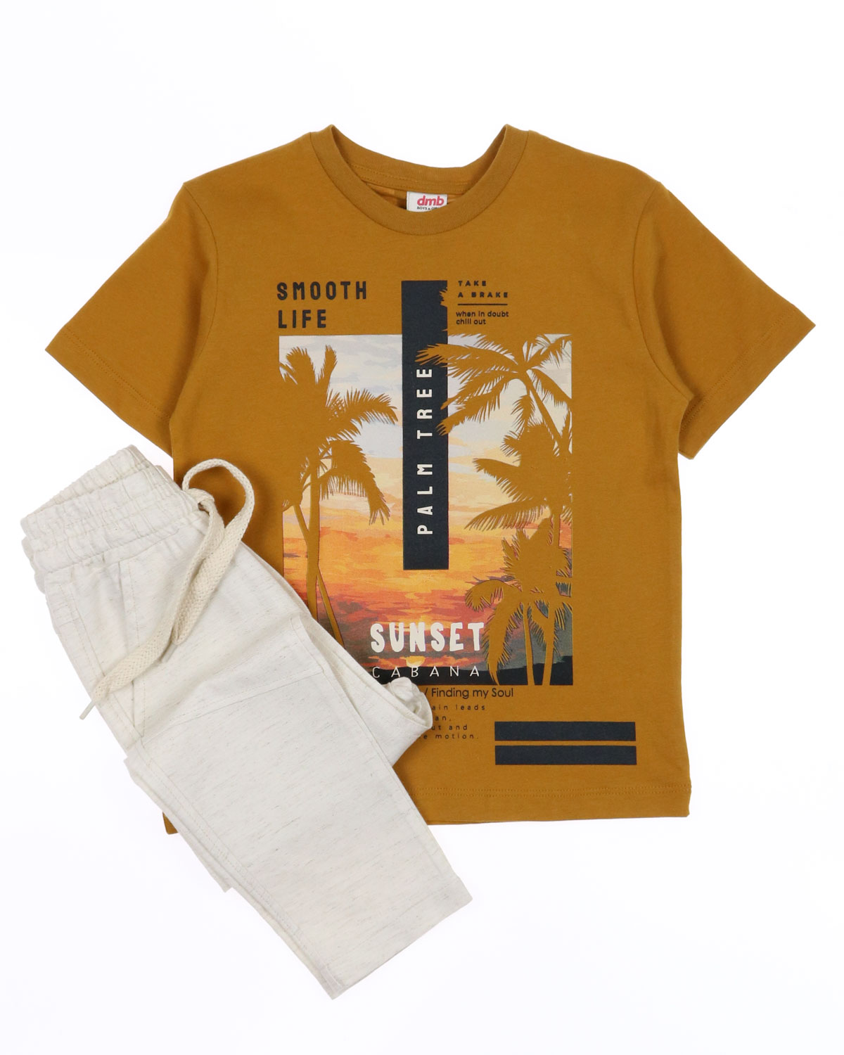 Летний костюм DMB для мальчика оптом. Футболка прямого кроя с короткими рукавами. Брюки легкие из хлопка без эластана с боковыми карманами. Пояс на резинке с функциональным шнурком позволяет ругулировать посадку на талии, штанины зауженные без манжетов.