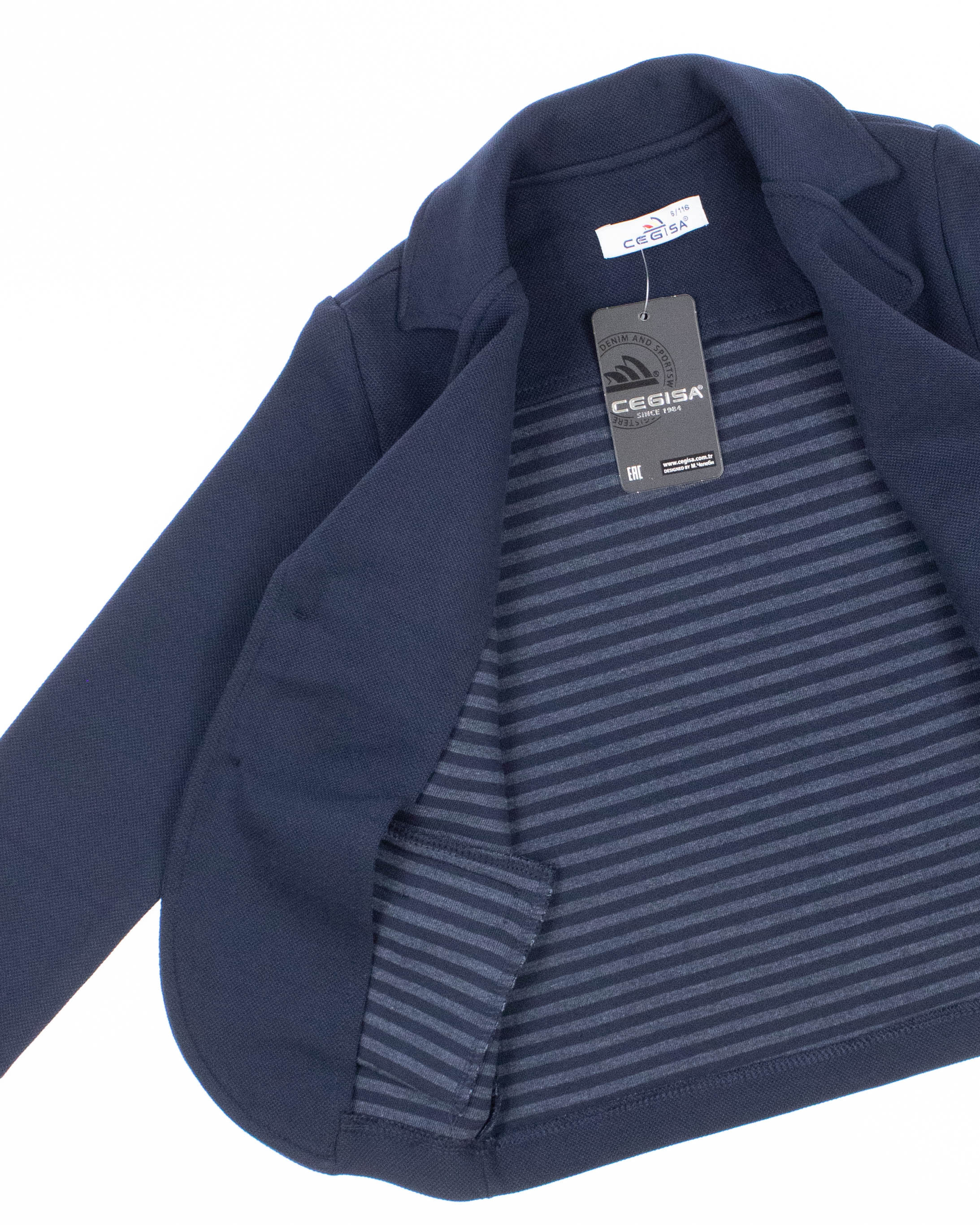 Трикотажный пиджак Cegisa для мальчика оптом. Выполнен из хлопковой ткани. Отложной воротник . Вместительные карманы и разъемная застежка - пуговицы. Хорошо сохраняет цвет и форму при длительной носке и после многократных стирок. Прекрасно будет смотреться как школьная форма.